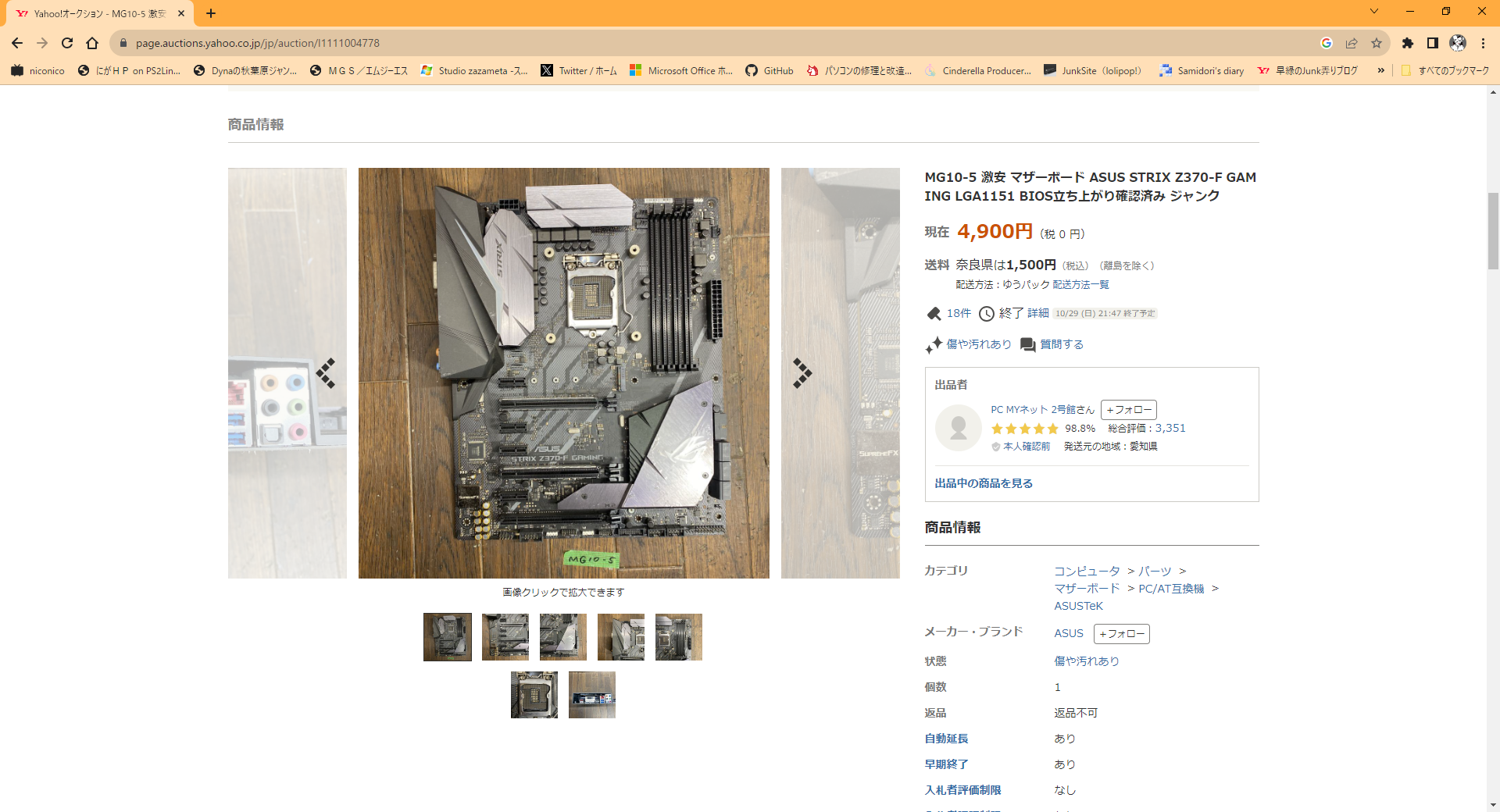 当時ぐらいの記事を多少探り決めたのはASUS ROG STRIX Z370-F GAMINGでした。しかもヤフオクで検索するとまさしく私に似つかわしいジャンクのマザーボードが。6000円上限とかで入札してみたところ送料込みでもだいたい6000円ぐらいという相場より多少安いかなという値段で落札できました。