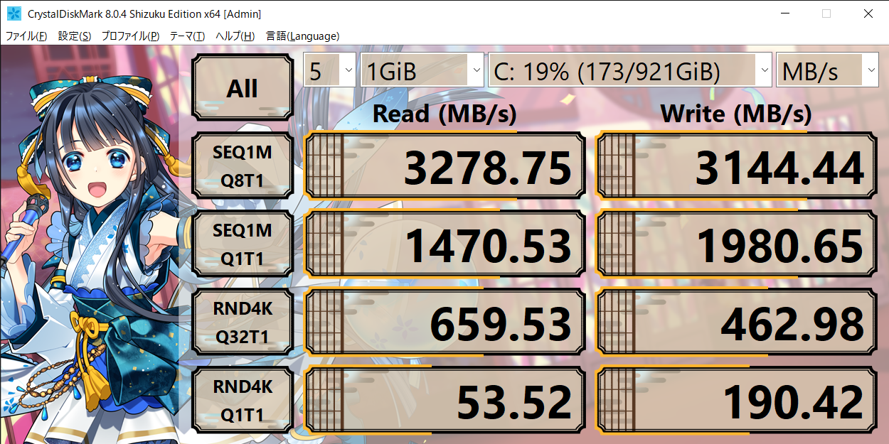 需要はないと思いますが一応DiskinfoとDiskMarkの結果です。※dynabook VZ72はGen3まで対応と思われるため公称値は出ません。