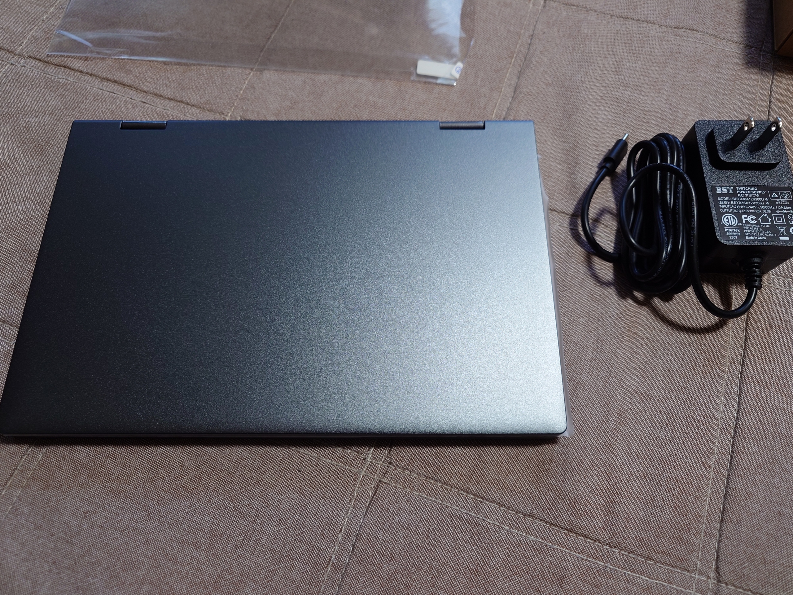 CHUWI MiniBook X N100です。11月29日の朝にメーカー直販サイトで注文したら次の日に届いてかなりびっくりしました。中国発送だと思っていたので1、2週間はかかると思っていたのに。お値段はブラックフライデーセールだからなのか50900円から14%割引のクーポンが効いて43774円でした。