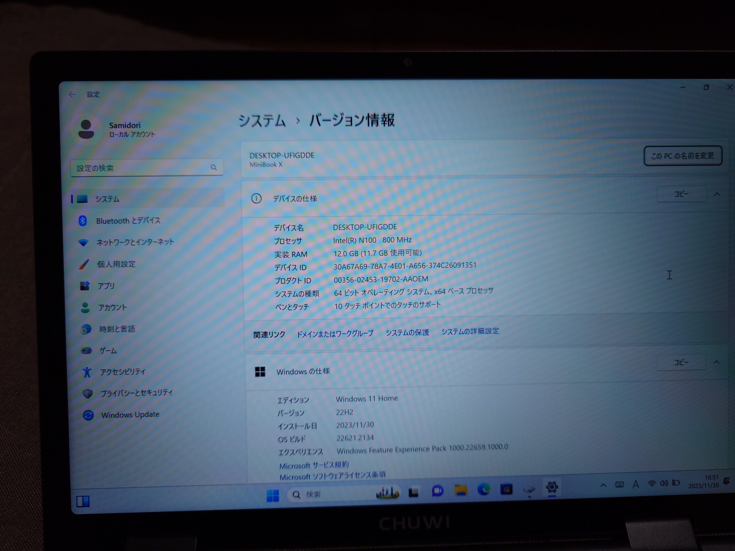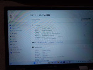 いきなりシステム確認です。Windows11HomeでバッチリIntel N100ですね。Core Mみたいな感じでベース速度は800Mhzなんですね…メモリーは12GB、SSDは512GBになっていてもうそんなスペックのものがこんな値段で買えるんだな…と思いますね…