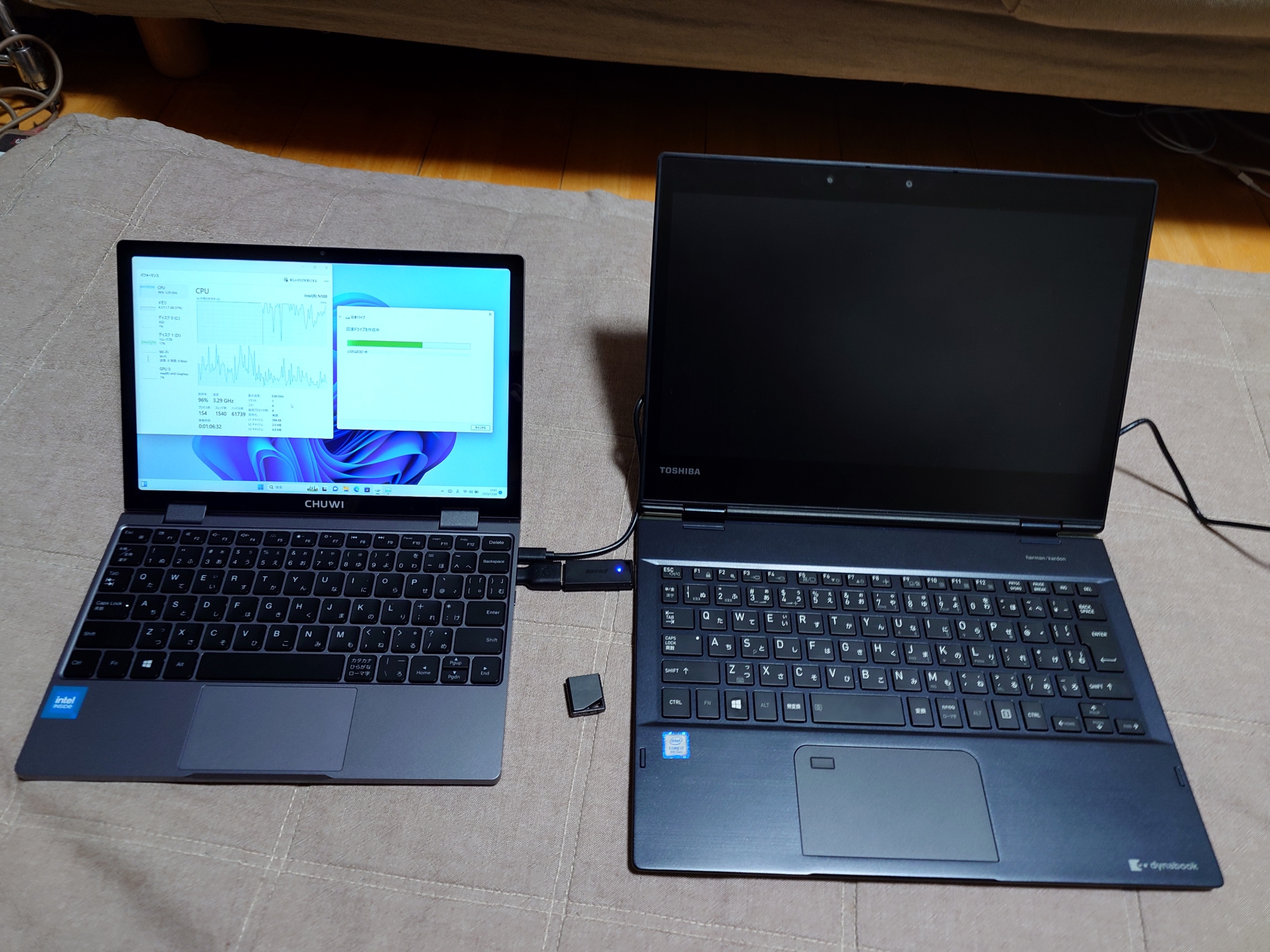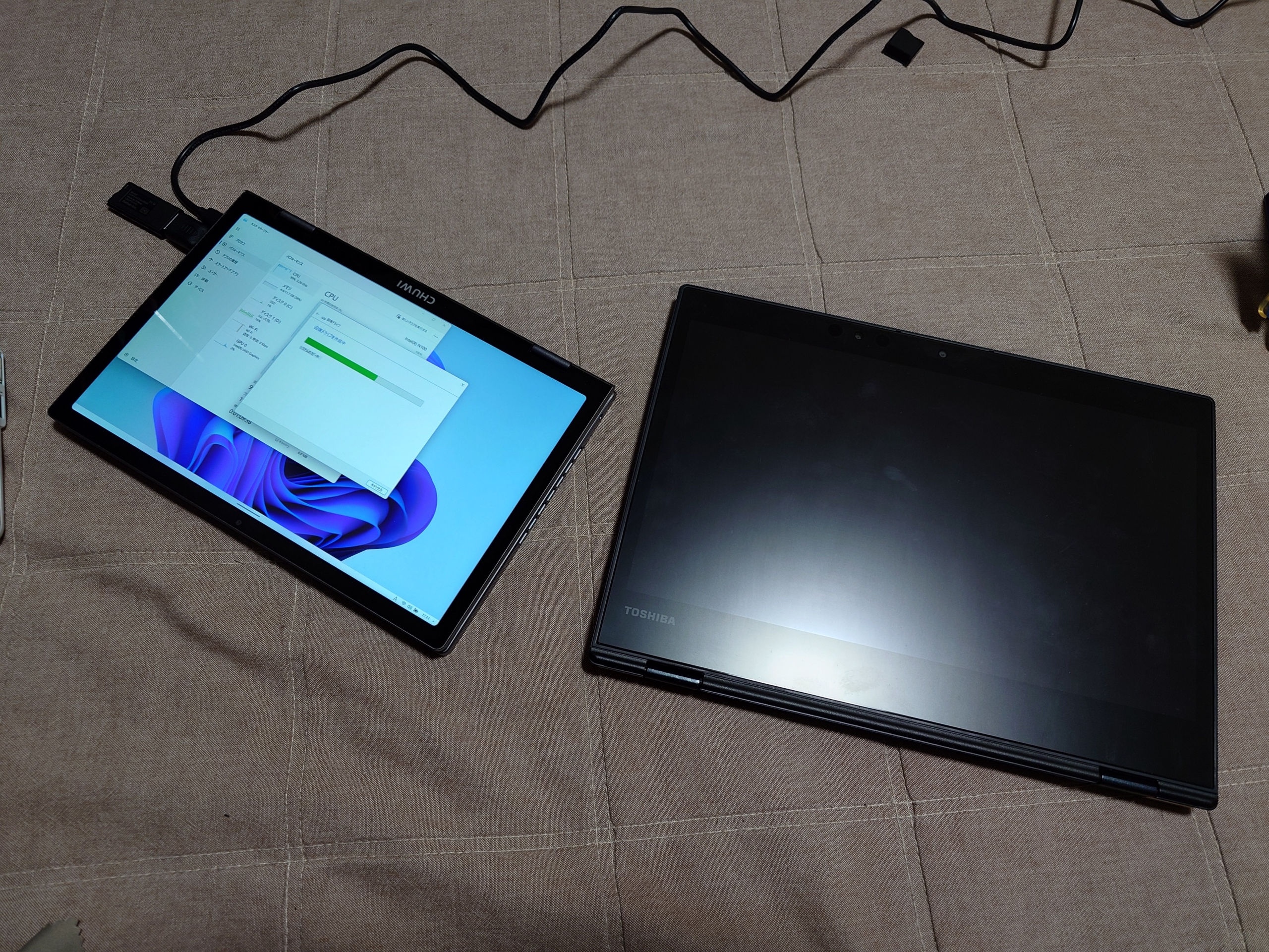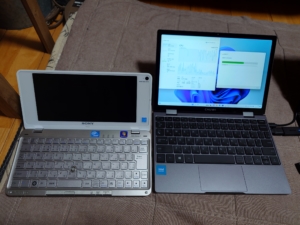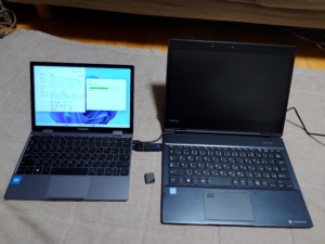 dynabook VZと一緒に折りたたんで見ました。dynabook VZはこのスタイルではほとんど使いませんでしたがMiniBook X N100の方が枠が狭いのでタブレット的な使い方ができるかもなーとか漠然と思いました。