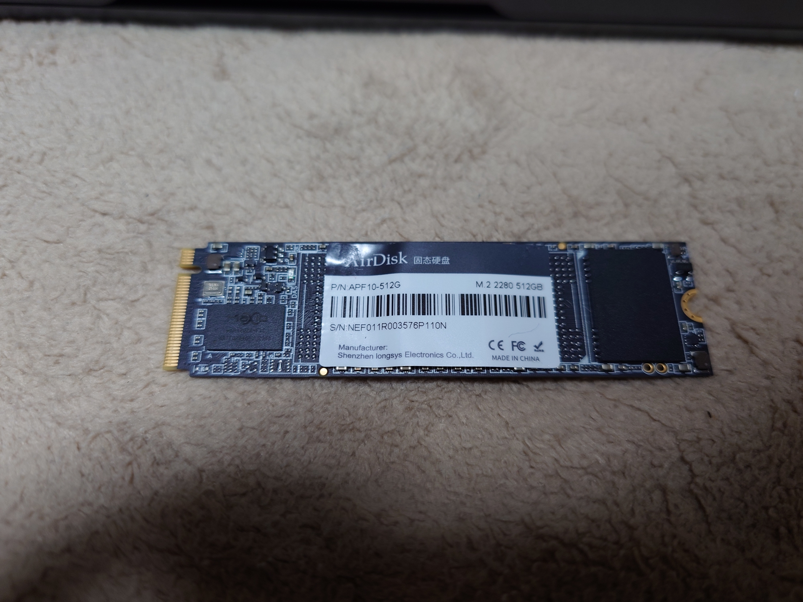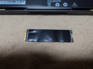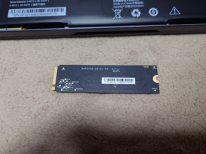 もともと入っていたSSDです。放熱シートが貼られていたのではがしたら銘板シールも付いてきて剥がすのに苦労してシールがぐしゃっとなってしまいました。