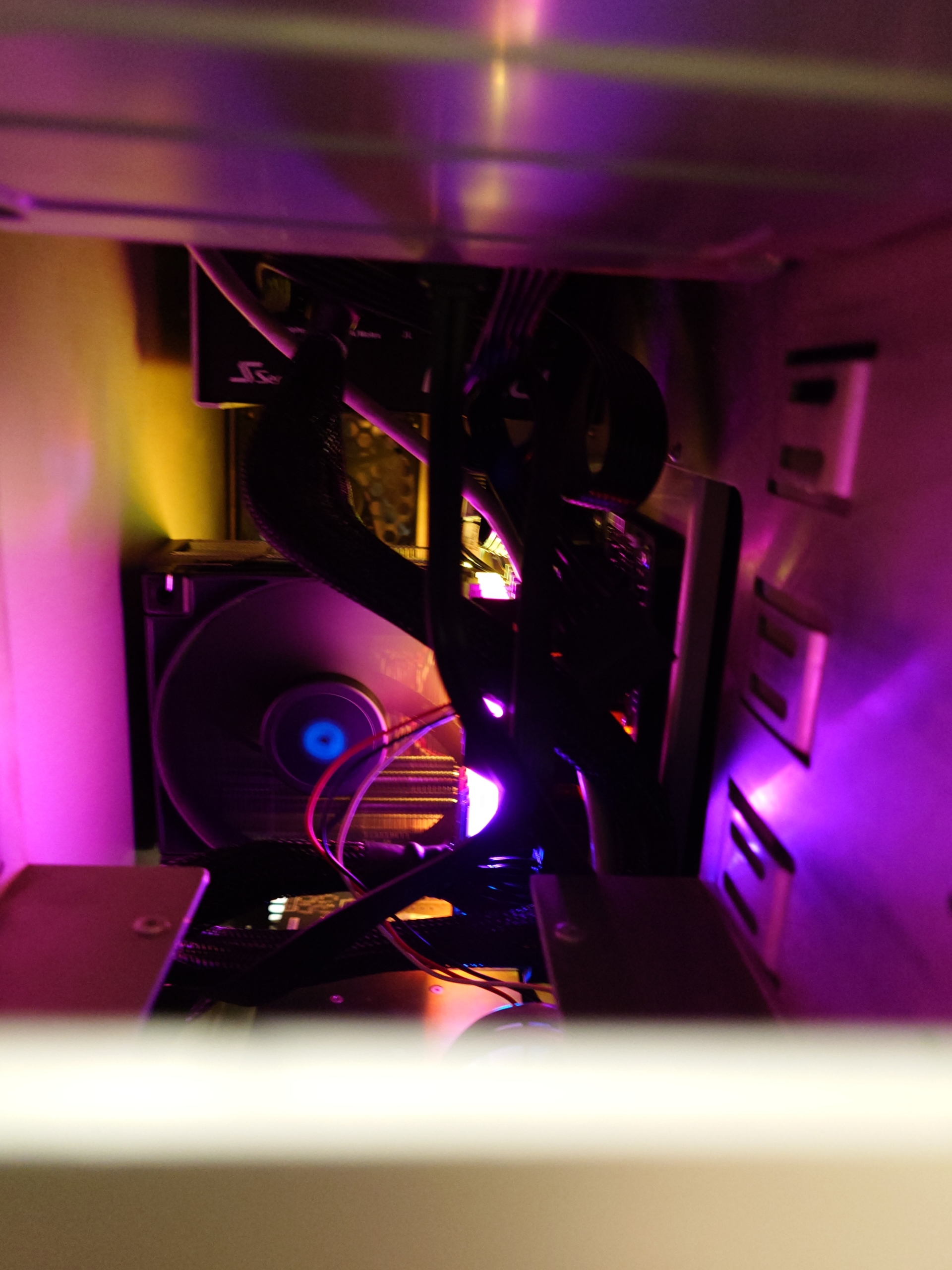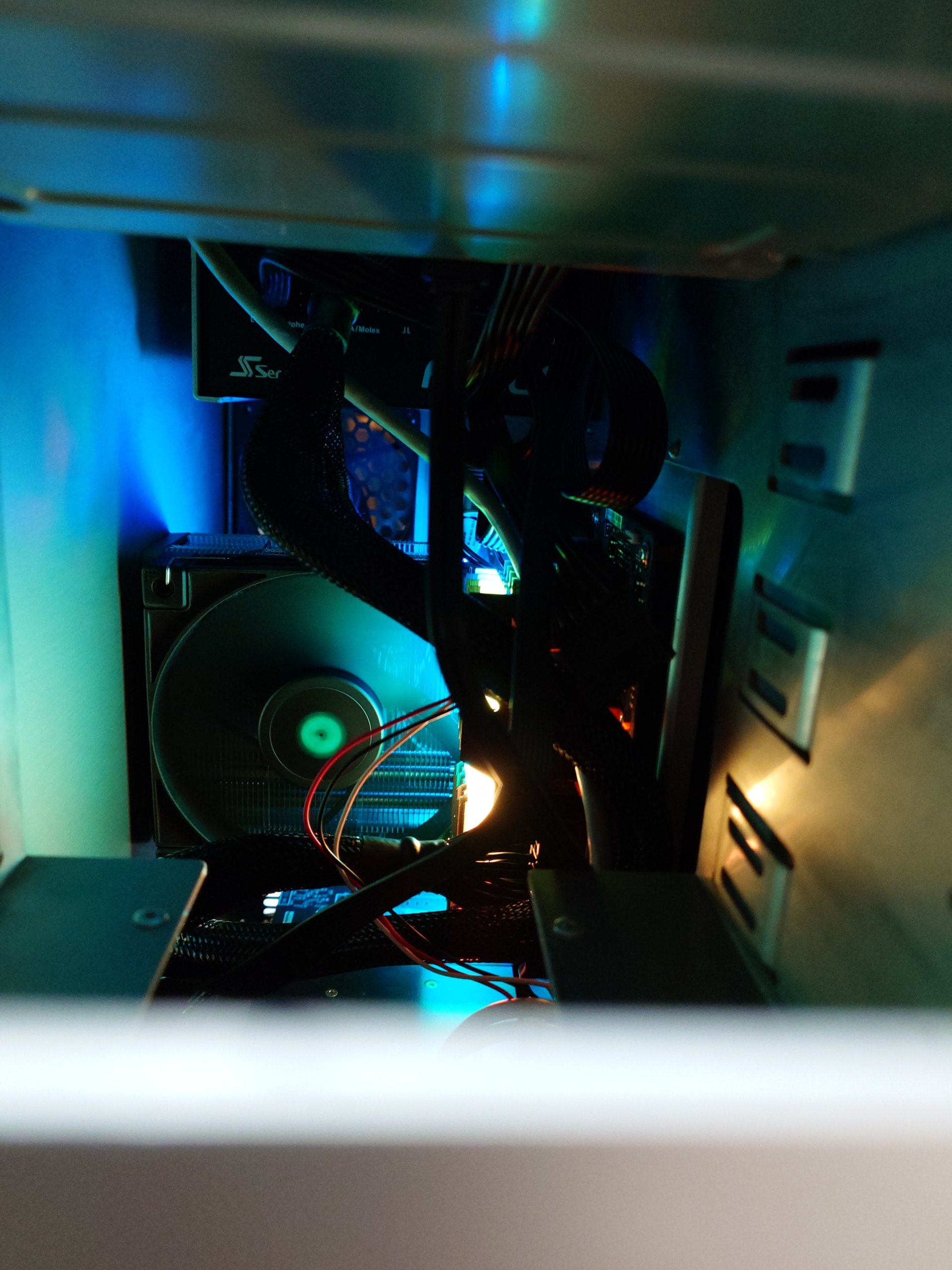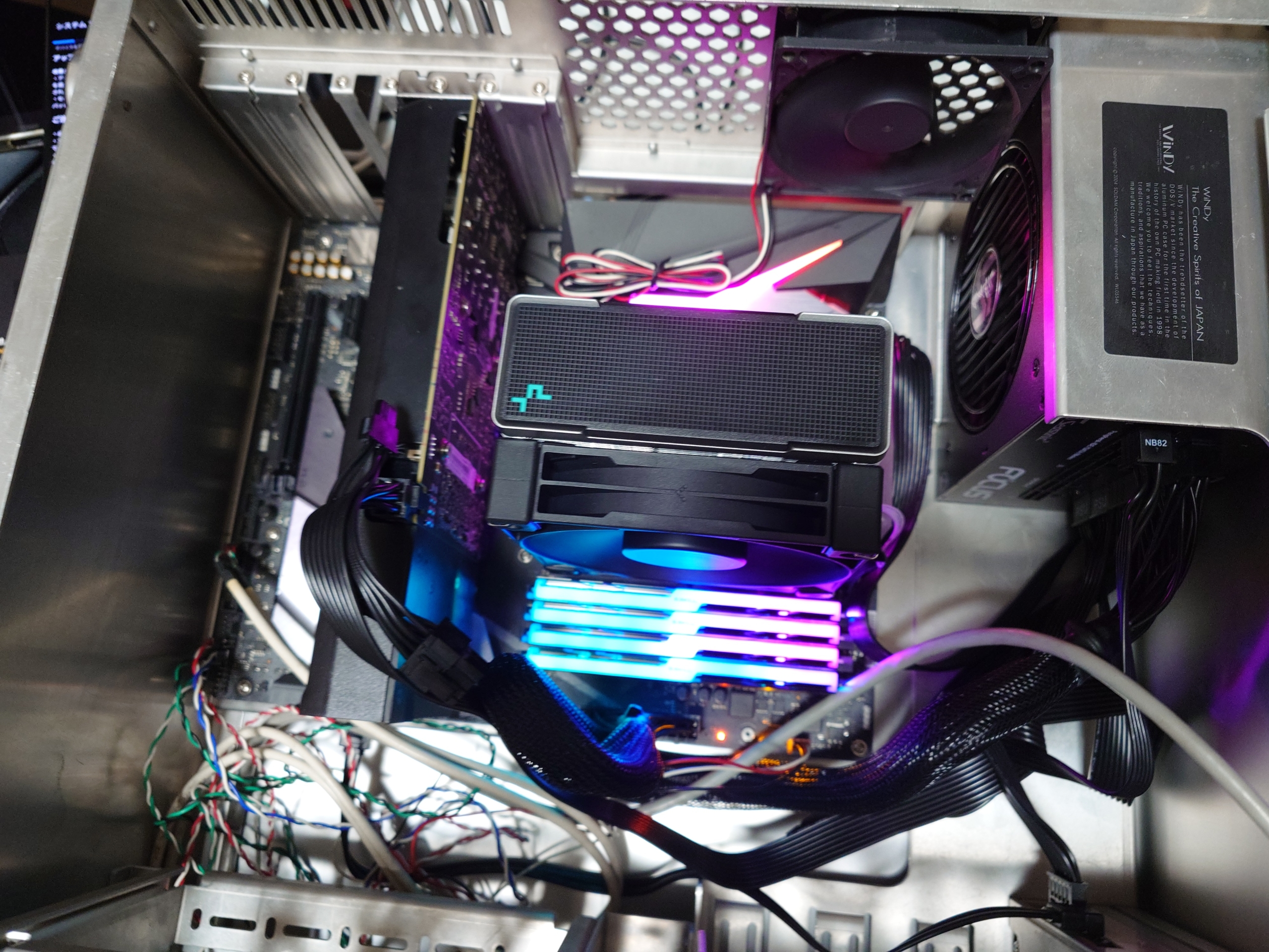 その結果ジャンクのマザーボードでしたが無事に起動してくれました。起動したときはうれしかったですね。そしてアルミケースでガードされてるので隙間からしか漏れてこないのですが選定したマザーボードとRAMメモリーがビカビカ光ってますね…(設定で切りました。)